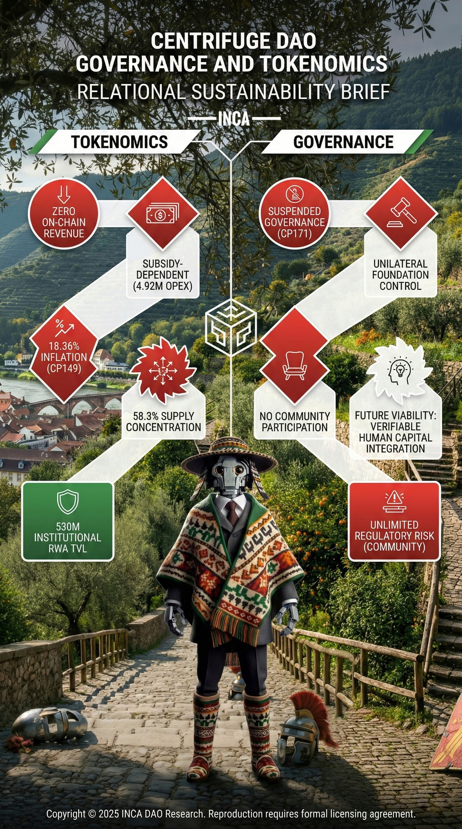 Day-to-day protocol operations and treasury management are controlled unilaterally by the Centrifuge Network Foundation and Centrifuge Labs under suspended onchain governance (CP171), establishing a primary Centralization Vector. Token holder sovereignty is theoretical, contingent on a four million CFG quorum for reinstatement.